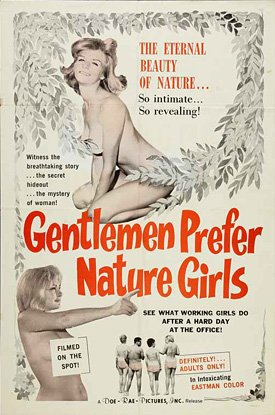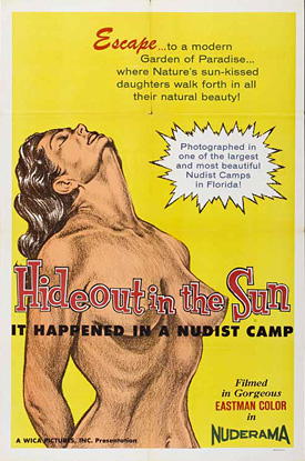 The pictures told stories that had to be told and just happened to demand a nudist camp setting in order to tell the story. There were nudist exposés (The Nudist Racket Exposed, Nature Camp Confidential), nudist advocacy (Gentlemen Prefer Nature Girls), nudist musicals (Goldilocks and the Three Bares), nudist historical romances (My Bare Lady), stories about robbers who hide out in nudist camps (Hideout in the Sun), nudist spy movies (Behind the Nude Curtain), outer space nudists (Nude on the Moon), celebrity nudists (The Wild Wild World of Jayne Mansfield, Blaze Starr Goes Nudist), nudist travelogues (Naked As Nature Intended, Isle of Levant), even nudists vs. monsters (Monster of Camp Sunshine).