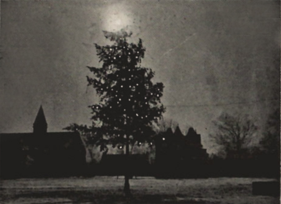 At a somber Christmas tree-lighting ceremony on a dark December night, where President William Oxley Thompson compared the Great War to Christ's birth as greatest events in history, the plaque was dedicated to the Buckeyes who had already died in the war and the hundreds in training for or in route to the slaughter in France. |
