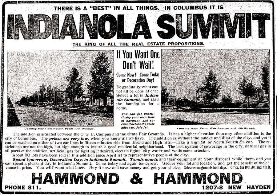The neighborhood before there was a neighborhood. Indianola Summit—“The King of All the Real Estate Propositions—invites buyers to come for a picnic, tennis game, and to select a lot on which to build a home on Decoration Day 1904. |